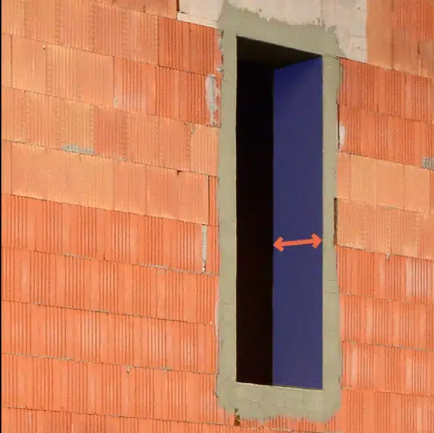 Na obrázku je ostenie vyznačené ako modrá plocha a oranžové šípky znázorňujú hĺbku ostenia.