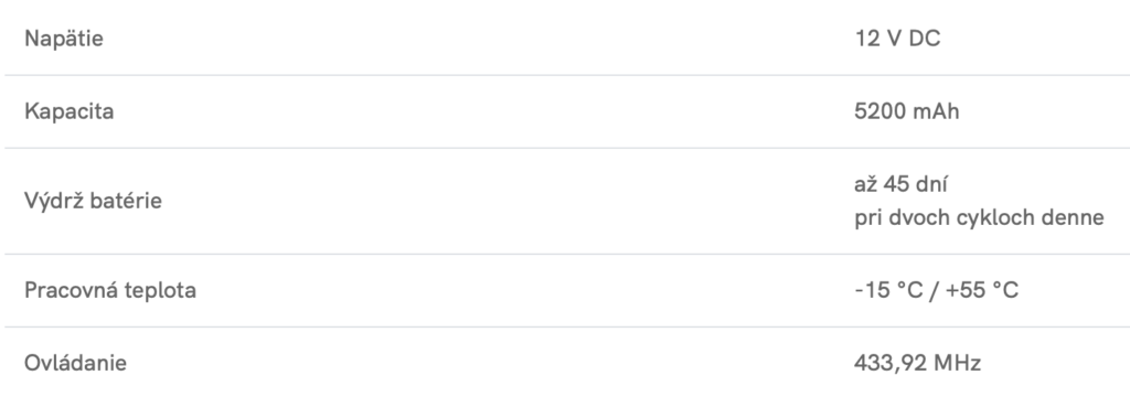 Rozmery výkonnej batérie umožňujú jej umiestnenie na horný profil alebo na iné vhodné miesto – maximálne však 3 metre od motora. Batériu dobíja solárny panel, vďaka čomu systém funguje bez pripojenia k elektrickej sieti. Pri plnom nabití batéria zabezpečí až 45 dní prevádzky bez slnečného svitu.